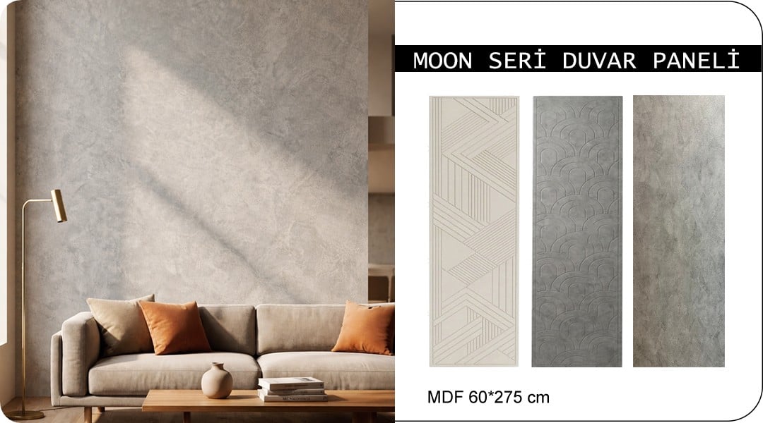 3D–MDF paneller, polimer/MDF lambri, boyanabilir çıta paketleri ve karo/pleksi aynalar öne çıkar.
